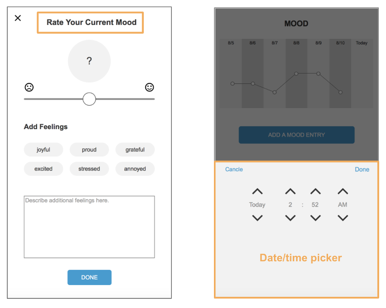 Instead of showing date/time picker immediately after users have selected the “Add a Mood entry” button, consider automatically taking the current date/time from the device and jump directly to the mood entry page.