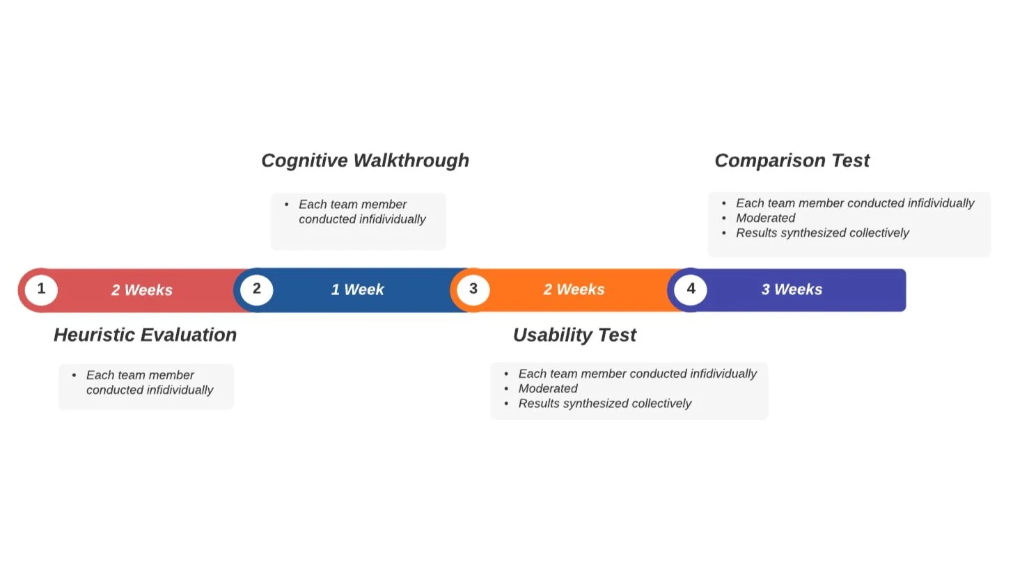 The weeks were divided between four phases: (1) Heuristic Evaluation, (2) Cognitive Walkthrough, (3) Usability Test, and (4) Comparison Test.